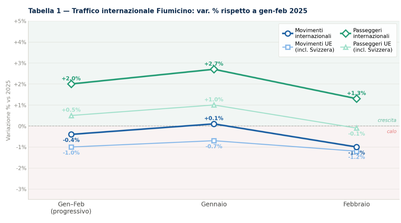 Fonte: ADR Aeroporti di Roma. Variazione percentuale rispetto allo stesso periodo 2025. I punti sul lato sinistro rappresentano il progressivo gennaio-febbraio; i punti centrali e destri il singolo mese. È importante segnalare che la riduzione sui voli nazionali dipende da: 1) ITA che per problemi ai motori ha dovuto tenere fermi alcuni aeromobili; 2) la giornata di sciopero che ha caratterizzato la performance del mese di febbraio
